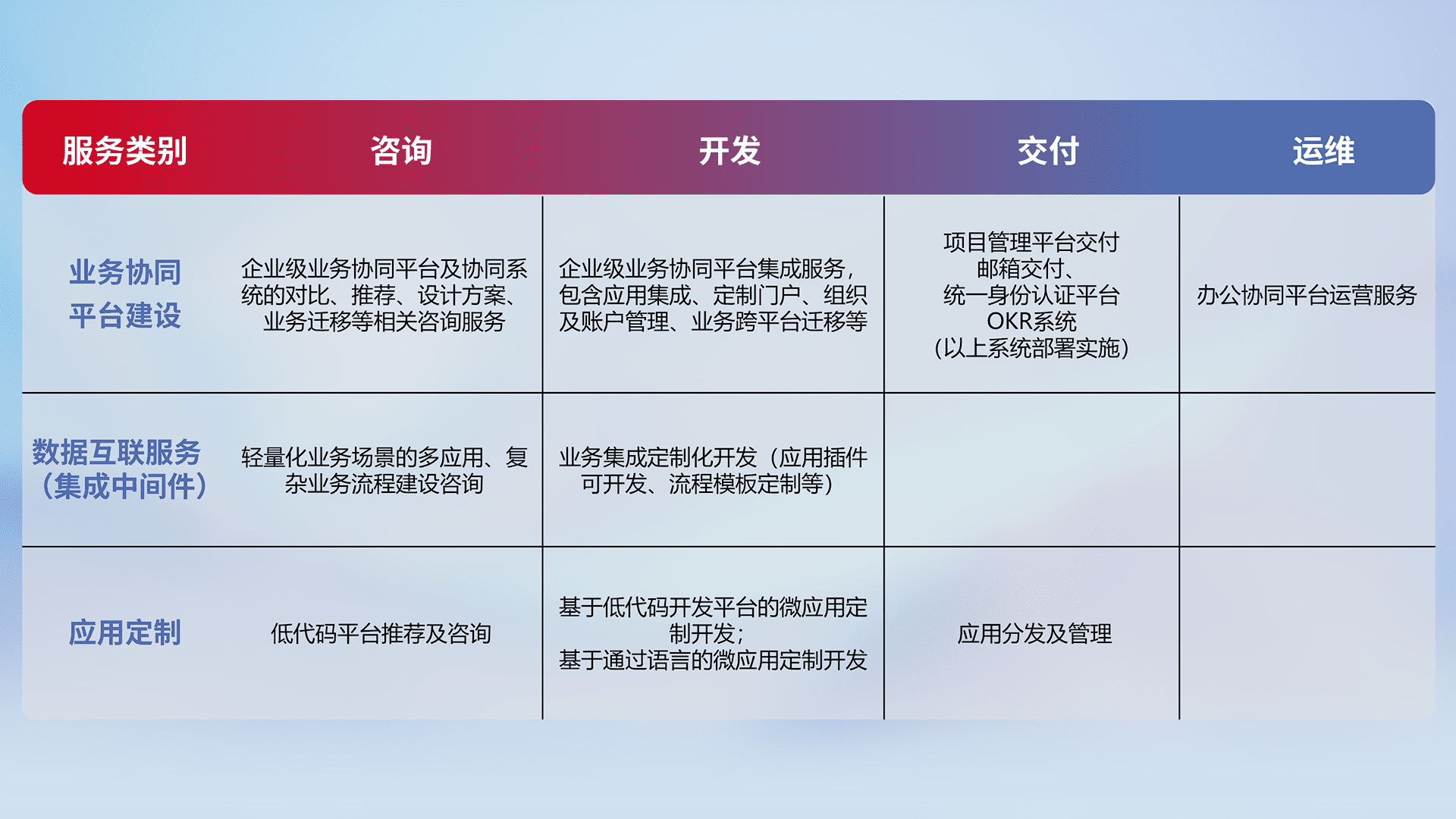 针对钉钉、、、、企微、、IDaas等平台级产品提供产品的规划、、方案、、交付、、定制化开发等服务,,,实现如统一协同办公、、智能客户服务、、、、混合会议管理、、、智能数据查询、、等业务场景,,实现数字化转型。。。